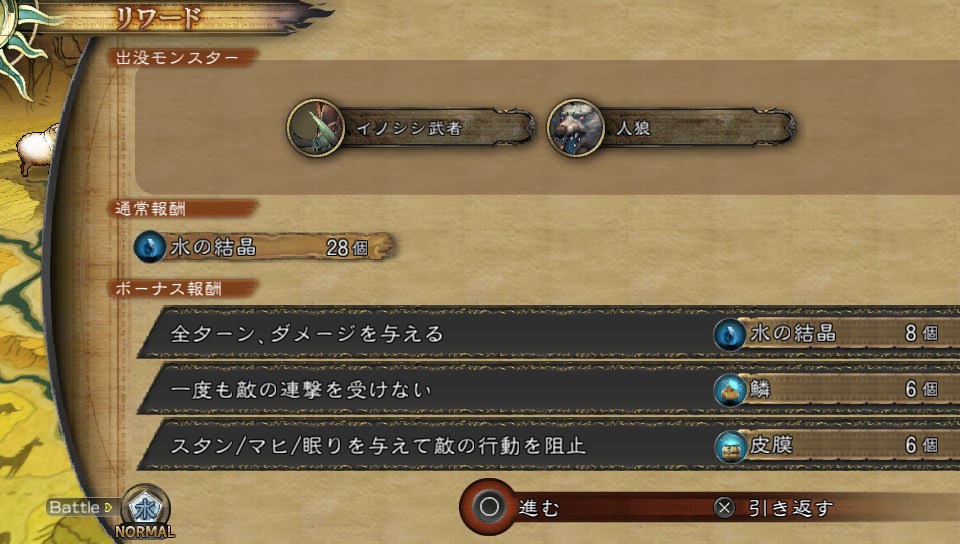 ワールドマップ上のポイントに近づくと、そこのイベントにおける戦闘の有無、有る場合は連続戦闘回数とそれぞれの戦闘の難易度(EASY~VERY HARD)、報酬アイテムなどの情報が開示され、そのうえで、戦闘に挑むか・挑まないかの選択ができます。