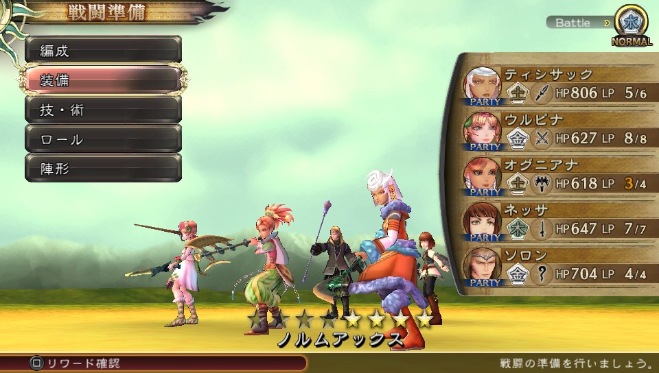 今回は「ノルムアックス」という、中心に配置した斧使いの消費BPが常時-1され、BP初期値4(☆☆☆☆)、ターン経過で1ずつ増える陣形を選択しています。