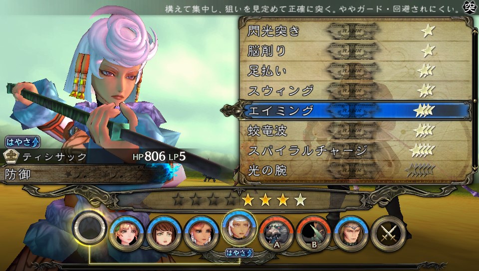 ティシサック(五行:土)がBP3を使って4手目にずれ込んで「エイミング(突属性)」を使おうとしている図↓