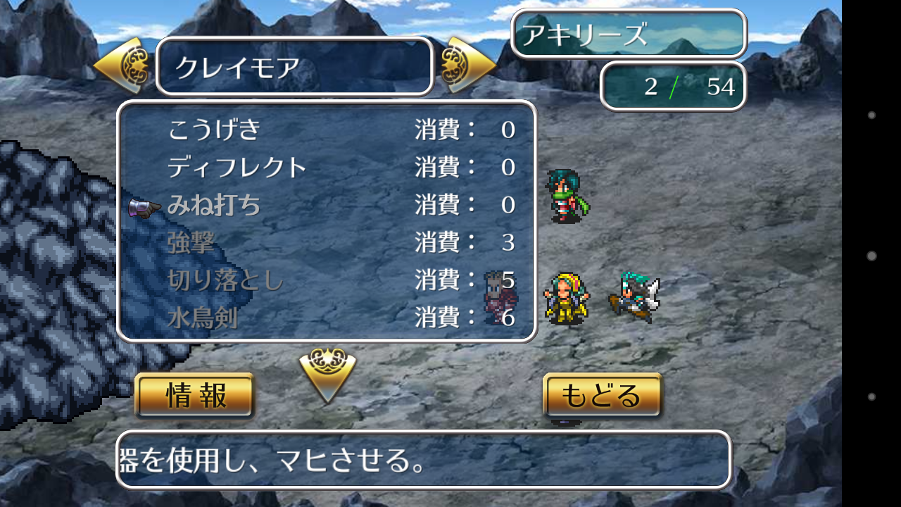 戦闘開始直後に全員にリヴァイヴァと水舞い(防御力up)、皇帝とアマゾネスはソードバリアを張って挑みました。リヴァイヴァでHP全回復で復活するのが一番助かりました。一度、皇帝に向けた音速剣をソードバリアが防いでくれました。メイルシュトロームが一番辛くて、2発くらえばもう壊滅です。