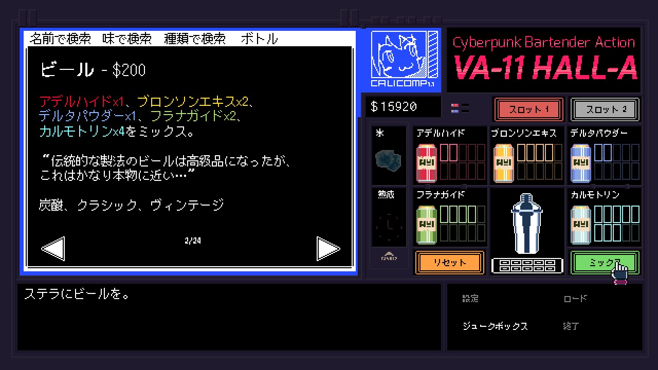 そういったときはレシピを検索して、より注文に近いカクテルを提供するよう注意を払いますが、わざと異なるカクテルを提供することもできるので、お客にどう接するかはプレイヤーに一任されています。